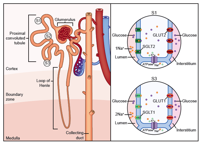 Νεφρική επαναρρόφηση γλυκόζης στο εγγύς νεφρικό σωληνάριοΝεφρική επαναρρόφηση γλυκόζης στο εγγύς νεφρικό σωληνάριο. Το 90% των περίπου 180 γραμμαρίων γλυκόζης που διηθείτε καθημερινά στο νεφρό επαναπορροφάται στο τμήμα S1 του εγγύς νεφρικού σωληναρίου μέσω των συμμεταφορέων SGLT2 και GLUT2. Το υπόλοιπο (περίπου 10%), της γλυκόζης, που δεν επαναπορροφήθηκε στο τμήμα S1, μπορεί να επαναπορροφηθεί στο τμήμα S3 από τους συμμεταφορείς SGLT1 και GLUT1