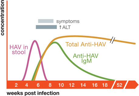 Η ανεύρεση ειδικών αντισωμάτων (IgM anti-HAV) έναντι του ιού, στο αίμα ατόμου με ύποπτα συμπτώματα για ηπατίτιδα, είναι απαραίτητη για τη διάγνωση. Τα αντισώματα είναι δυνατόν να ανιχνευθούν κατά την οξεία νόσο, όταν ανέρχεται η δραστηριότητα των τρανσαμινασών και συνεχίζεται η διασπορά του ιού με τα κόπρανα και παραμένουν ανιχνεύσιμα για 6-12 μήνες. Κατά την ανάρρωση αναπτύσσονται αντισώματα IgG anti-HAV, τα οποία παραμένουν ανιχνεύσιμα επ΄αόριστον και προσδίδουν ανοσία σε αναλοίμωξη.